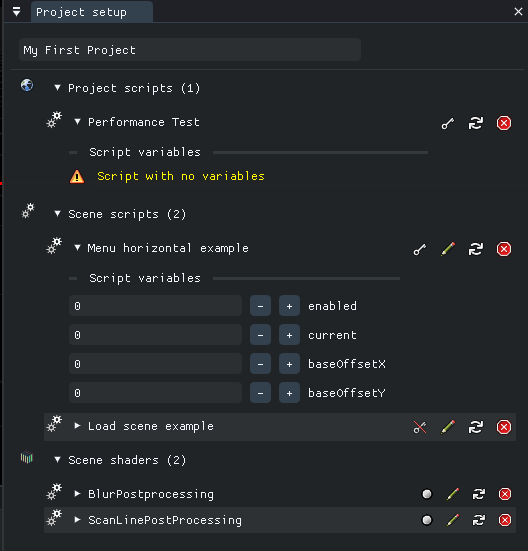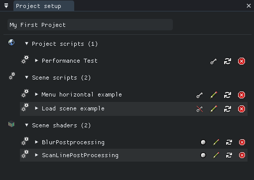 The Project setup widget allows us to configure the global Scripts and the post-processing Shaders that are applied to the scene.